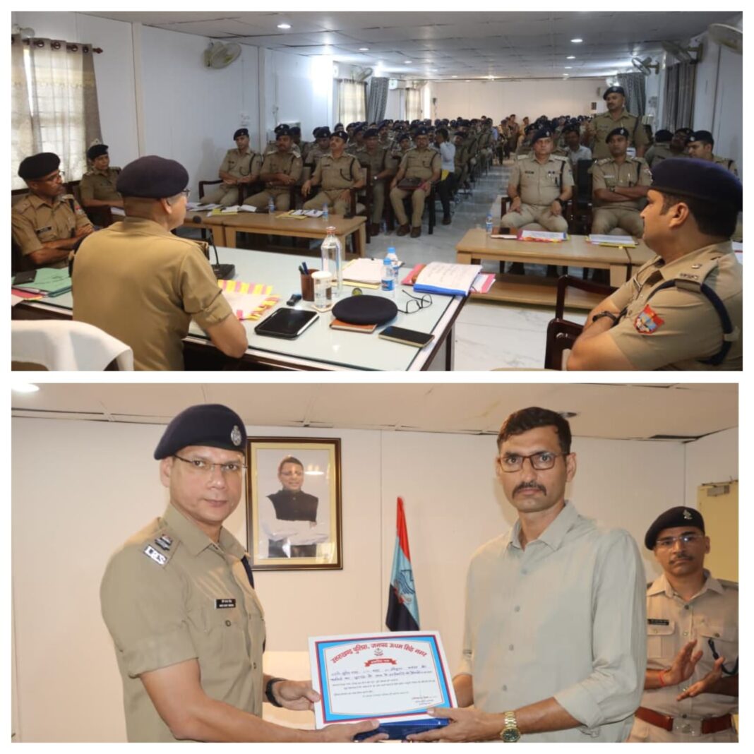 गोष्ठी के दौरान विगत माह में मादक पदार्थों की बरामदगी, अपराध नियंत्रण एवं जनसेवा में उत्कृष्ट कार्य करने वाले 21 पुलिस अधिकारी एवं कर्मचारियों को एसएसपी मणिकांत मिश्रा द्वारा प्रशस्ति पत्र एवं पारितोषिक प्रदान कर सम्मानित किया गया।